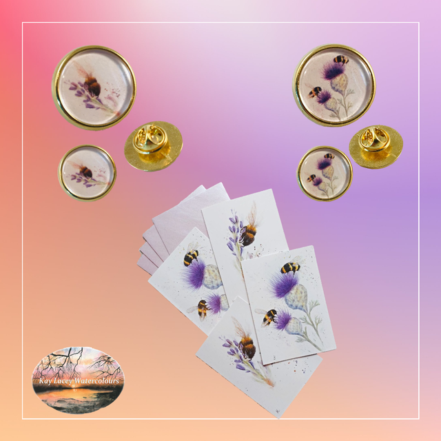 A choice of Lapel Pins featuring unique Bee artwork by Kay Lacey Watercolours.