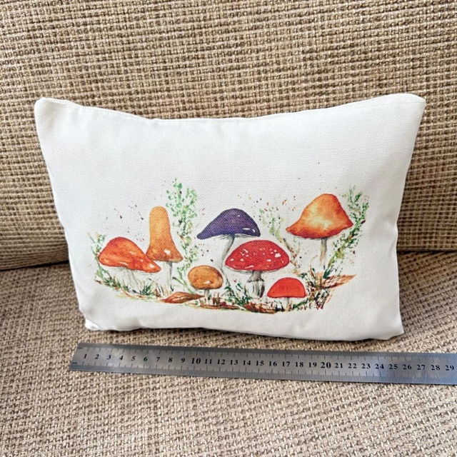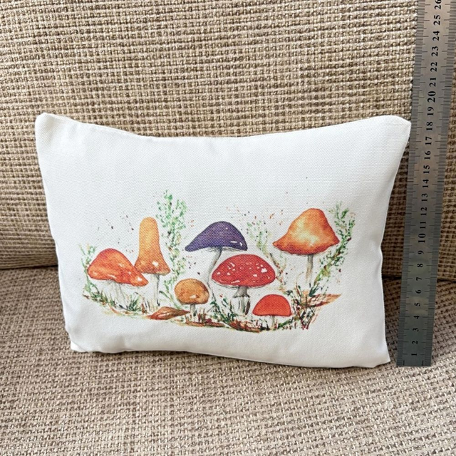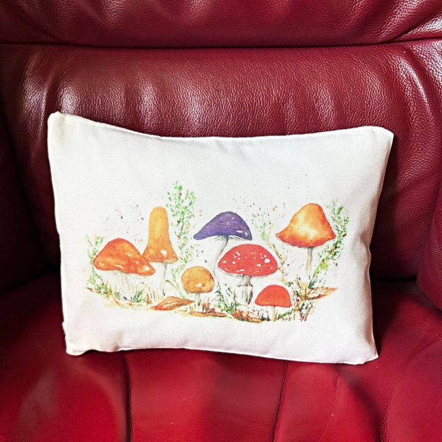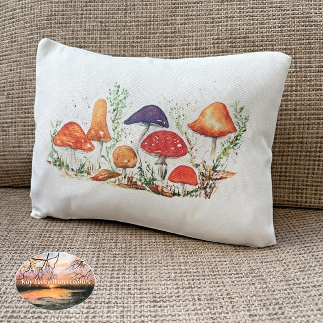Add a touch of nature to your home with this Fungi Art Cushion. Beautiful Linen Boudoir Cushion measuring 24 x 20 cm with a hidden zip and a fibre inner pad. Featuring original artwork 'Fungi' by Kay Lacey it has been sublimation printed and heat pressed onto the soft textured canvas / linen cover in my own studio. The reverse of the cushion is plain.