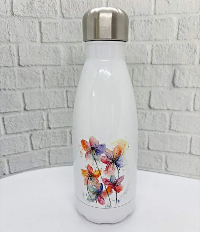 Stainless Steel, this small flask style bottle feature 3 images of my Fanciful Florals artwork around the base /body of the bottle.
