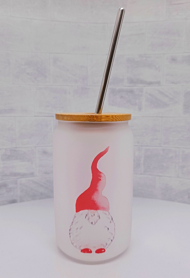 Frosted Glass Tumblers, Ideal for Cocktails, parties or just for fun drinks. This pretty semi clear frosted glass comes with the addition of 3 images of my ‘Santa Gnome ’ artwork which has been sublimation printed by me in my own studio. The designs are hard wearing and will not wear off and take on the frosted appearance of the glass. These Can shaped glass jars / tumblers have a volume of 13oz Each comes with bamboo lid that features a rubber seal to prevent spillages and will also protect your drink from insects (n.b. this is not leakproof) and a stainless steel straw. They Measure 7cm x 13cm Each has its own brown box Postage can be combined for multiple purchases. Please message for International postage (Please note that some computer screens may render colour differently depending on the browser used. The colour of the original may vary slightly from the colour you see)