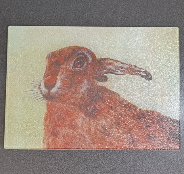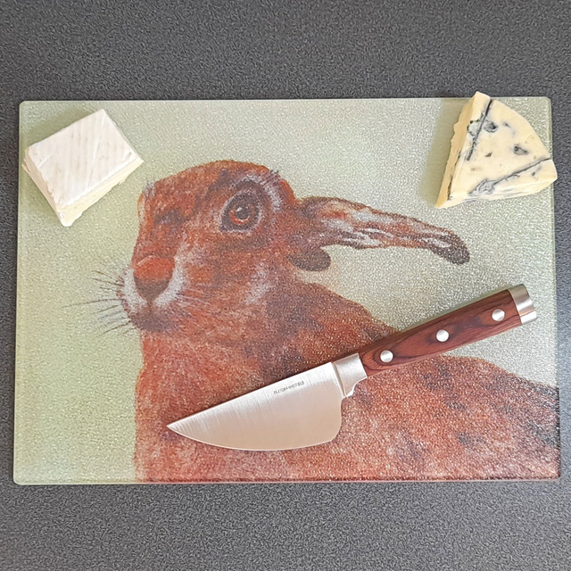 Featuring my original Hare artwork 'Turning to Spring' which has been sublimation printed and heat pressed by me onto the back of the glass making it completely heat resistant These are multi-purpose and can be used as placemats, chopping boards, cheese boards, or hot pot / hot saucepan stands / surface protectors. The textured surface glistens slightly making an attract finish above the artwork. Each chopping board has 4 rubber stoppers on the underneath to prevent sliding and to protect the surface it is placed upon.