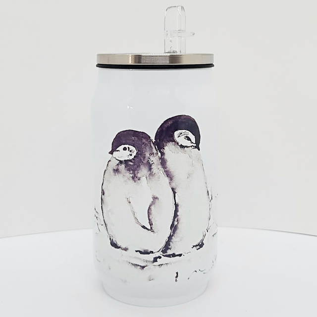 Stainless steel 'coke' style 9 oz can (re-useable mug or cup) featuring Penguin artwork 'Warming Up' .
